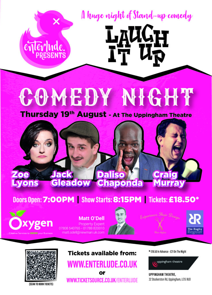 Enterlude present Laugh It up – A Huge Night of Stand Up Comedy Headlined by Zoe Lyons & Guests Daliso Chaponda – Jack Gleadow & MC Craig Murray. Venue is the Uppingham School Theatre at 32 Stockerston Rd Uppingham, Rutland. Tickets are £18.50 and available from www.enterlude.co.uk or www.ticketsource.co.uk/enterlude Another amazing Laugh It Up line up from organisers […]