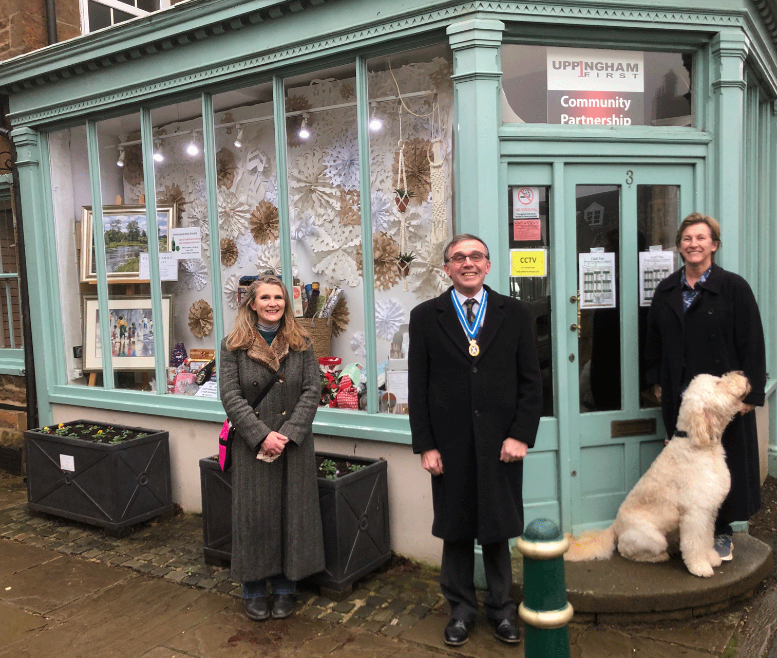 Richard Cole, High Sheriff of Rutland is pictured, centre, visiting the market place pop up shop ‘Window of Hope’ created by community partnership Uppingham First